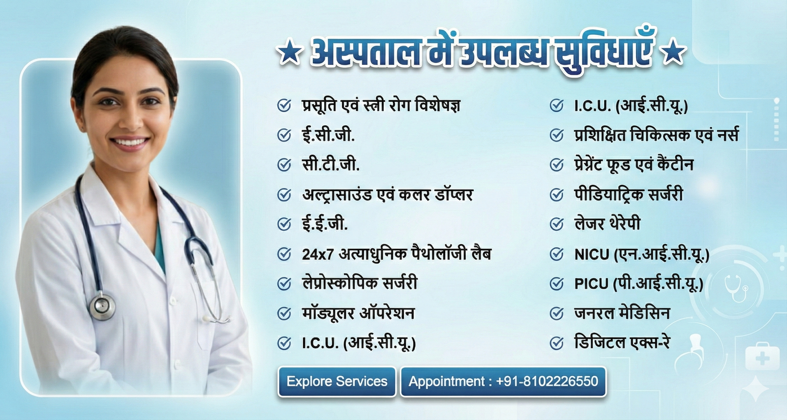Emergency Room, ICU, NICU, PICU, Labor Room & In-House Ambulance Service.